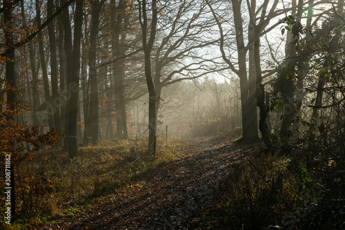 Herbstlicher Wald Weg mit Laub und Sonne durchflutet
