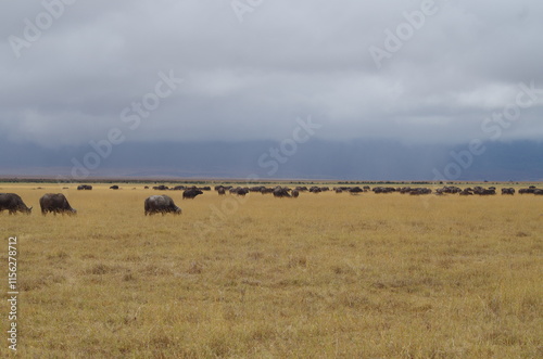 Herd of African Buffalo Grazing in the Grassland, Tanzania