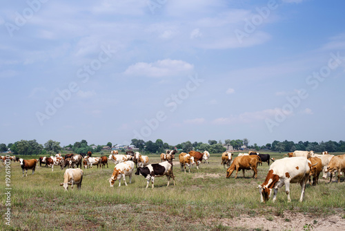 Herd of cows and horses are grazed on a meadow in summer sunny day