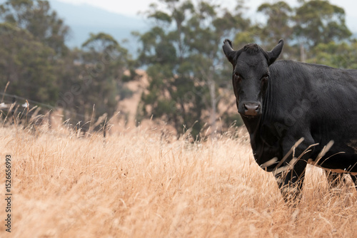 herd of cows in a field grazing on green lush pasture. Expansive Australian Farm Landscape with a dam, Trees, and Distant Grazing Livestock. Rural Agriculture and Sustainable Land Management australia