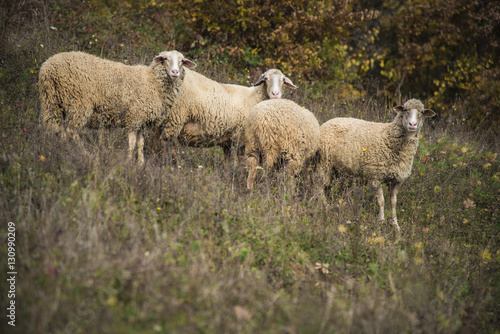 Herd of domestic sheep grazing the grass in an open field on a mountain