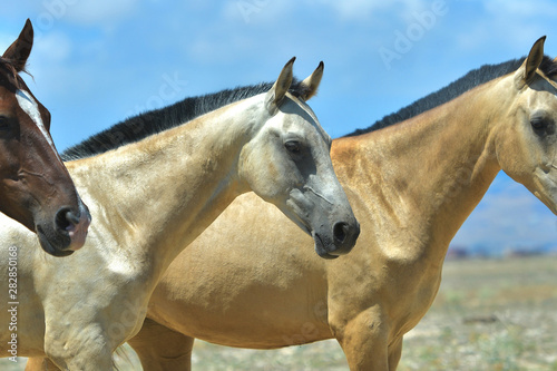 Herd of free young akhal teke breed horses againt brigh blue sky. Many colorful youngsters walking in freedom.