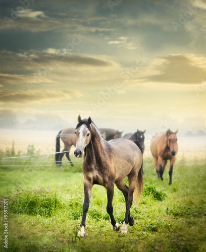 Herd of horses on summer pasture over beautiful dawn sky