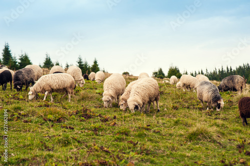 Herd of sheep graze on green pasture in the mountains. Young white and brown sheep graze on the farm.