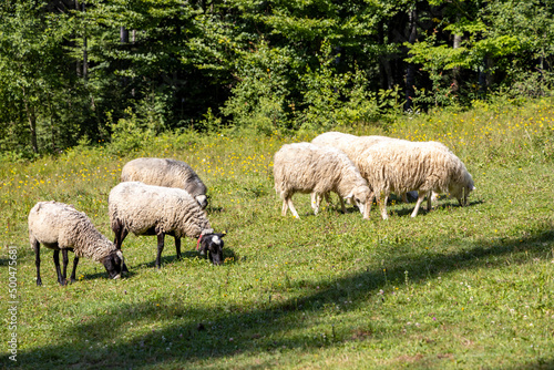 Herd of sheep on a mountain meadow of the Ukrainian Carpathians