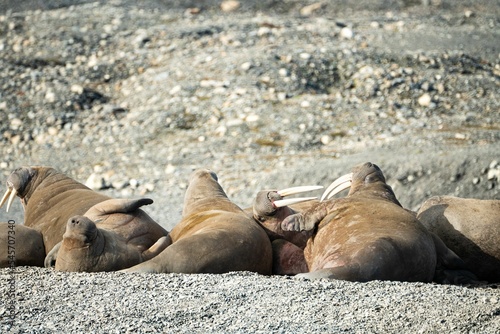 Herd of walruses (Odobenus rosmarus) bathing on a beach on Spitsbergen