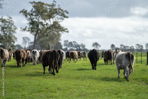 herding and mustering cows on a farm and ranch in spring in Australia. Aerial footage