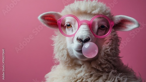 Here's a and keyword list for your image.. Cute sheep wearing pink glasses and blowing bubblegum against a pink background.
