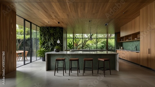 Here's a caption and keywords for your stock photo.. Modern kitchen with green island, wood accents, and garden view.