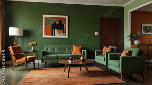 Here's a description and keywords for your stock photo.. Mid-century modern living room with green walls, orange rug, and green sofa.