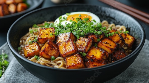Here's a possible and keyword list for your stock photo.. Delicious pan-fried tofu ramen with soft boiled egg and spring onions.