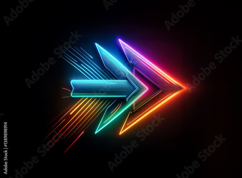 Here's the description and keywords: A neon-colored arrow with a luminous, futuristic design is shown on a black backdrop. The gradient of lights creating a sense of movement. The direction is obviou