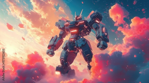 Heroic Anime Robot Pose in a Vibrant Sci-Fi Scene with Dynamic Lighting and Clouds