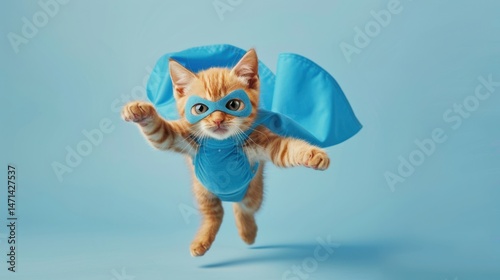 heroic brown tabby cat dressed as superhero wearing blue cloak and mask jumping and flying on light blue background, perfect for creative copy space use