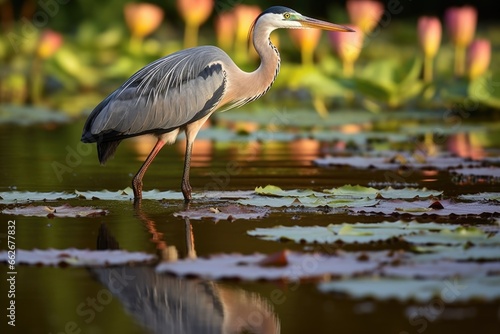 heron wading in a shallow water lily pond
