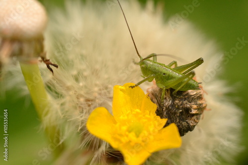Heuschrecke auf Pusteblume, Löwenzahn und gelbe Dotterblume
