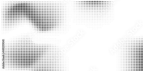Hexagon halftone gradient texture. Abstract black and white spotted grunge background. Geometric retro tech wallpaper. Fading wavy hexagonal pattern backdrop. Vector vanishing honeycomb grunge overlay