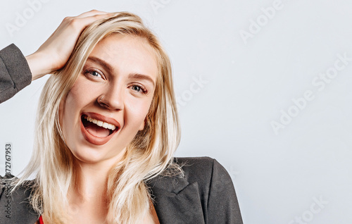 Hey smile at you. The blonde girl is happy and holds her hand to her head. A beautiful woman is pleased with an excellent business proposal. Nose piercing, rhinestone on the tooth. Isolated background