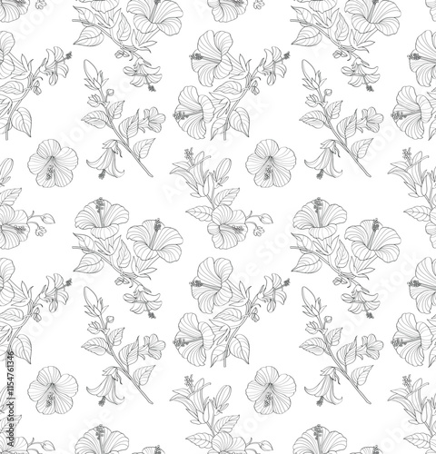 Hibiscus Flower line art. Seamless pattern for decorating fashion designs, fabrics, wallpapers and prints on a white background.