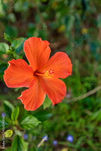 HIBISCUS FLOWER ON A GREEN BACKGROUND. IN THE TROPICAL GARDEN, DA LAT, VIETNAM