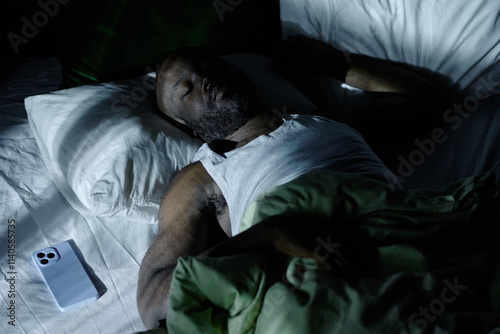 High angle shot of African American man sleeping tight in comfortable bed with fresh linen