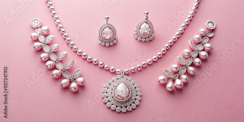 High angle shot of elegant jewelry set on pink background, ring, necklace, diamonds, luxury, fashion, accessories, beauty