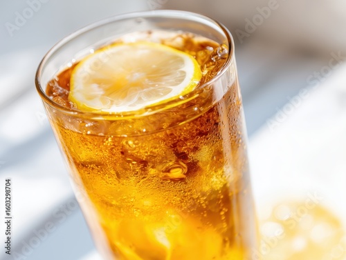 High Angle Shot of Iced Tea with Lemon Slice and Ice in a Transparent Glass on White Surface