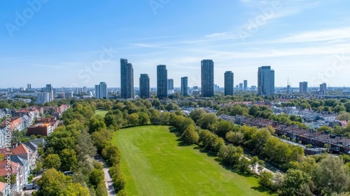 High angle view of a city park encompassing a cityscape. A grassy field stretches across the foreground, encircled by lush trees and greenery. Modern