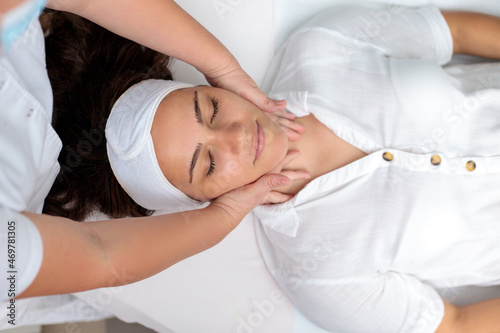 High angle view of a young Caucasian woman receiving face and neck massage during beauty treatment in cosmetic salon