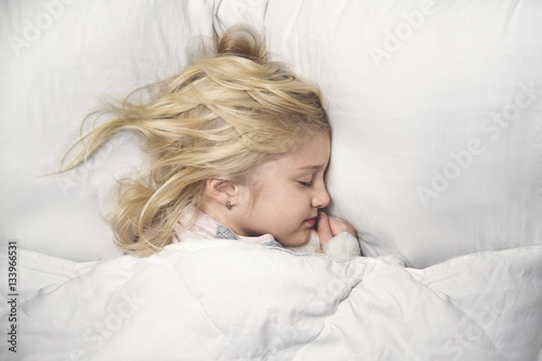 High angle view of cute girl sleeping on bed at home
