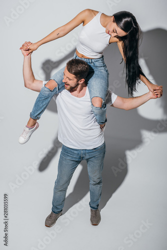 high angle view of young man holding girlfriend on shoulders while smiling and holding hands