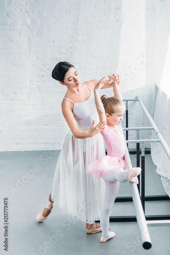 high angle view young ballet teacher exercising with adorable child in ballet studio