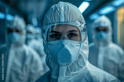 High definition group photos of semiconductor laboratory researchers in dust-free clothing capturing rich details in a technology research room.