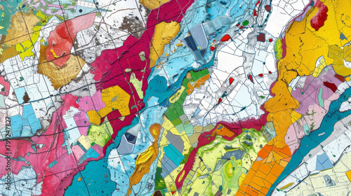 High detail texture of a vibrant, multicolored geological map for educational and scientific use
