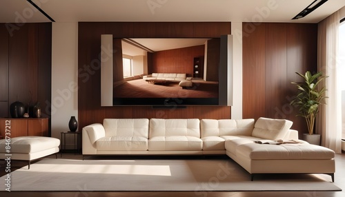 High end modern living room with white leather couch and a large flat screen tv mounted on the wall, brutalist architecture mixed with modern futuristic minimal design