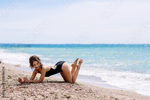 High fashion look.glamor beautiful sexy stylish brunette young female model with bright make-up, with perfect sunbathing clean skin in a black swimsuit on the beach in fashion style