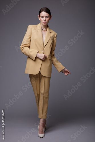 High fashion photo of a beautiful elegant young woman in a pretty beige sand suit, jacket, pants, trousers, accessories posing on gray background. Studio Shot. Slim figure.