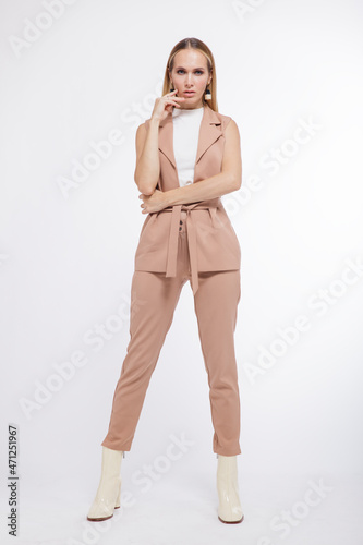 High fashion photo of a beautiful elegant young woman in a pretty beige suit, pants, trousers, vest, boots posing over white, soft gray background. Studio Shot, portrait. Blonde