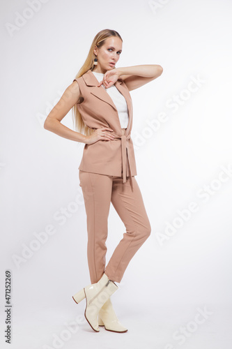 High fashion photo of a beautiful elegant young woman in a pretty beige suit, pants, trousers, vest, boots posing over white, soft gray background. Studio Shot, portrait. Blonde