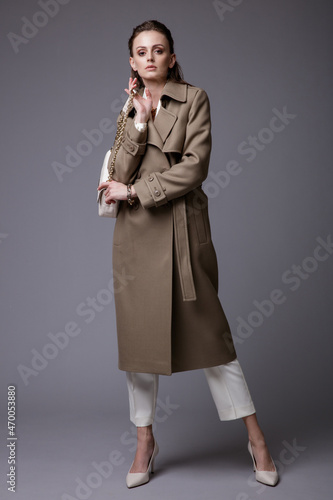 High fashion photo of a beautiful elegant young woman in a pretty dark beige, brown suit, accessories, white handbag posing on gray background. Studio Shot. Slim figure.