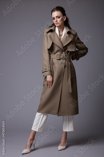 High fashion photo of a beautiful elegant young woman in a pretty dark beige, brown suit, accessories, white handbag posing on gray background. Studio Shot. Slim figure.