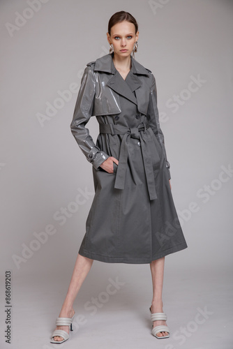 High fashion photo of a beautiful skinny young woman in pretty gray coat, jacket posing on studio background. Slim figure. monochrome