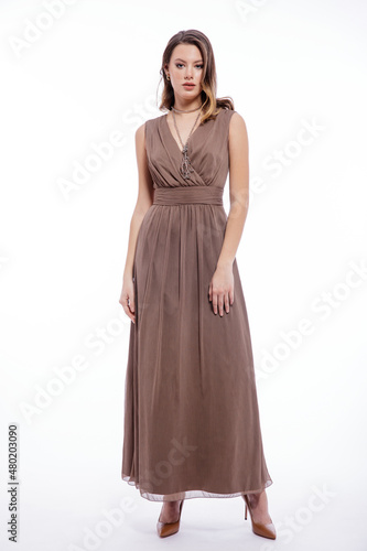 High fashion photo of beautiful elegant young woman in a pretty beige brown dress with a neckline, necklace posing on white background. Slim figure, make up, luxurious hair, shiny curls. Studio Shot