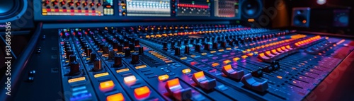 High Fidelity Production A sound engineers workspace highlighted by a sophisticated mixing console, capturing the essence of modern music production