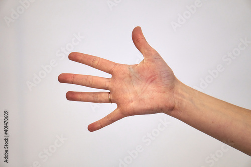 High five. Right palm Caucasian female hand shows 5 fingers. Hand brush on a white background. High quality photo