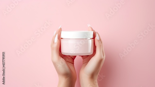 High quality photo of female hand holding cosmetic cream jar on pink background Copy space available for branding of beauty product. Mockup image