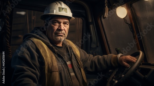 high quality picture, Mining industry truck driver in hard hat on background cabin of his lorry, 16:9, copy space