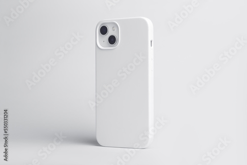 high quality starlight color iPhone 14 plus case mock up side view, smart phone in white soft silicone case isolated on gray background, rotated position. Smartphone perspective view