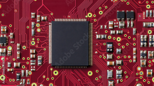 High resolution close up of red circuit board with microchip, showcasing intricate electronic components and connections. Ideal for technology and engineering themes
