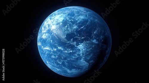 High resolution digital surrealism of Earth space view blue atmosphere black background glowing edges lens flare
